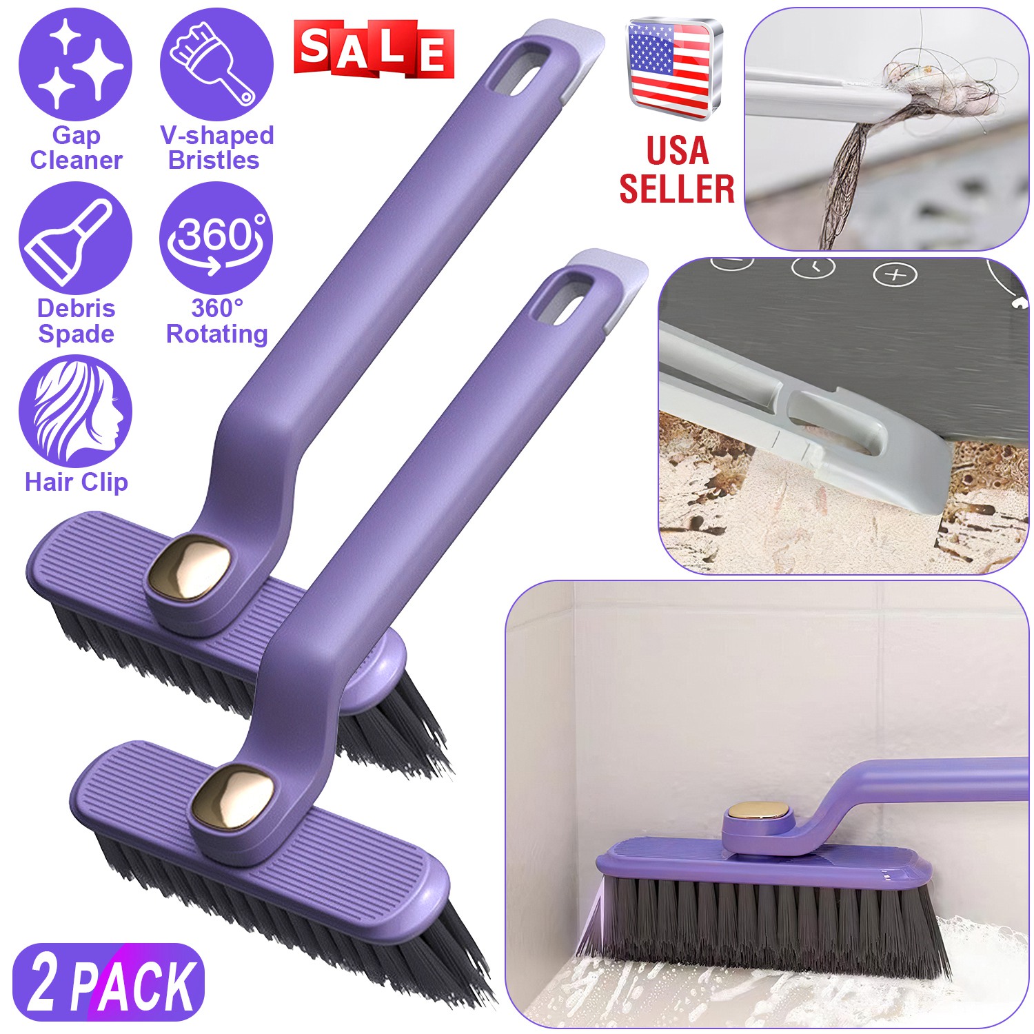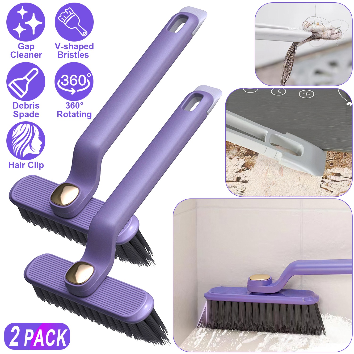 Cleaning crevice is always a challenging task due to their narrow and awkward shapes. Our multi-function rotating crevice cleaning brush can efficiently remove accumulated debris in any gaps, corners, edges. Its 360° rotation enables the brush head to maneuver effortlessly around corners and along edges, ensuring thorough cleaning without leaving blind spots. V-shaped hard bristles are tailored to tackle narrow gaps. Also includes 2 in 1 clip and spade, which allows you to secure hair from the bath drain and remove debris from the edges of walls. Come with 2 packs for daily use. Widely used for tiles, shower door tracks, sink drains, sliding door tracks, window frames etc.. A perfect crevice cleaning tool!