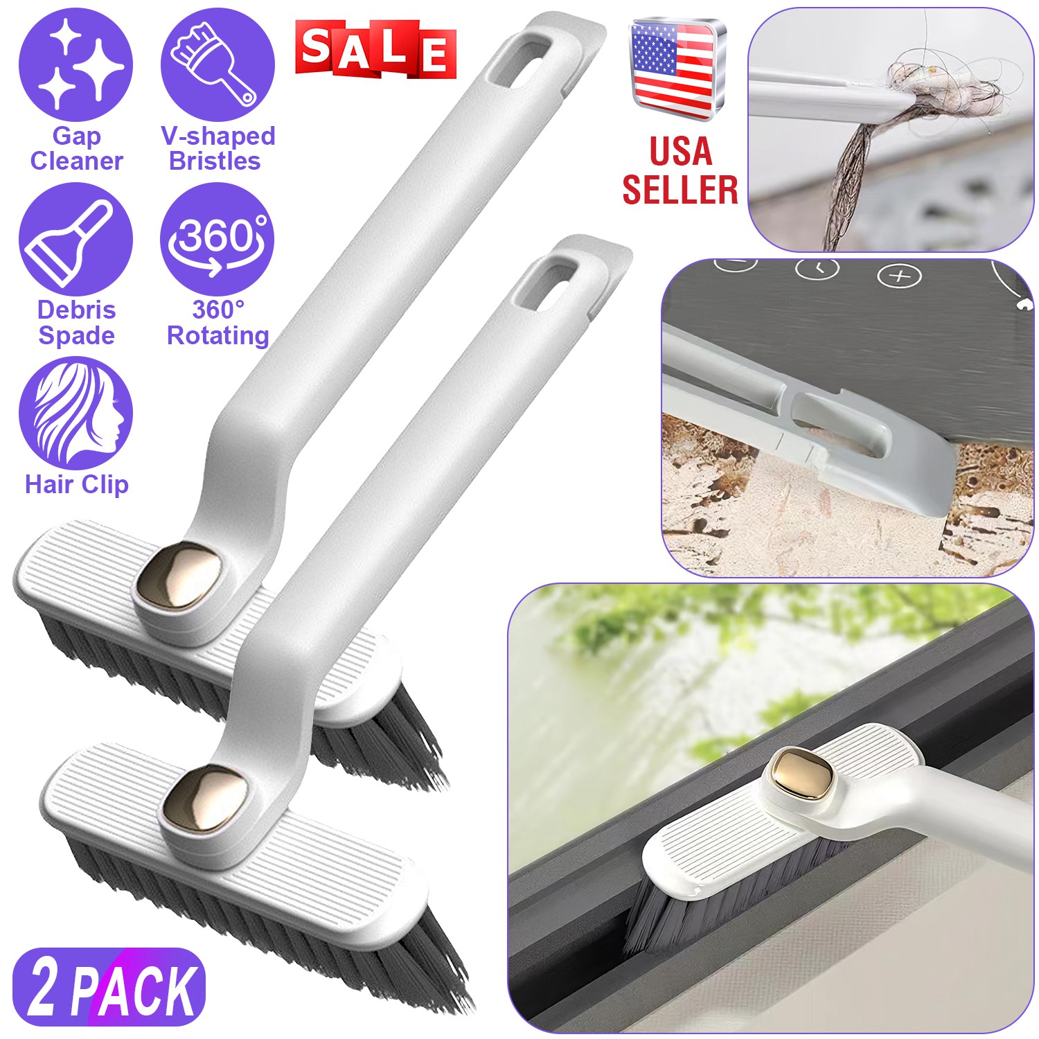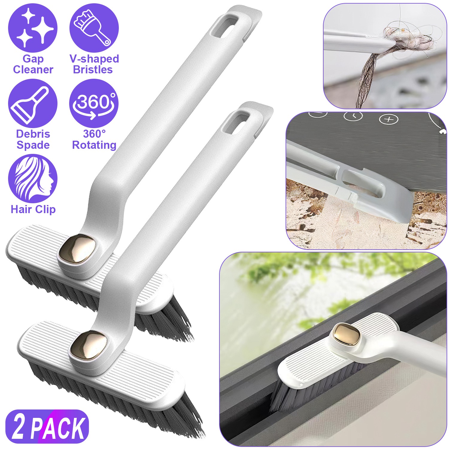 Cleaning crevice is always a challenging task due to their narrow and awkward shapes. Our multi-function rotating crevice cleaning brush can efficiently remove accumulated debris in any gaps, corners, edges. Its 360° rotation enables the brush head to maneuver effortlessly around corners and along edges, ensuring thorough cleaning without leaving blind spots. V-shaped hard bristles are tailored to tackle narrow gaps. Also includes 2 in 1 clip and spade, which allows you to secure hair from the bath drain and remove debris from the edges of walls. Come with 2 packs for daily use. Widely used for tiles, shower door tracks, sink drains, sliding door tracks, window frames etc.. A perfect crevice cleaning tool!