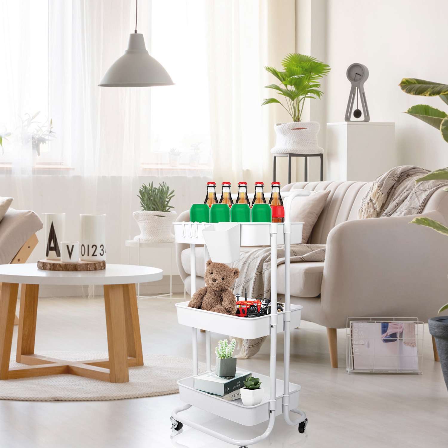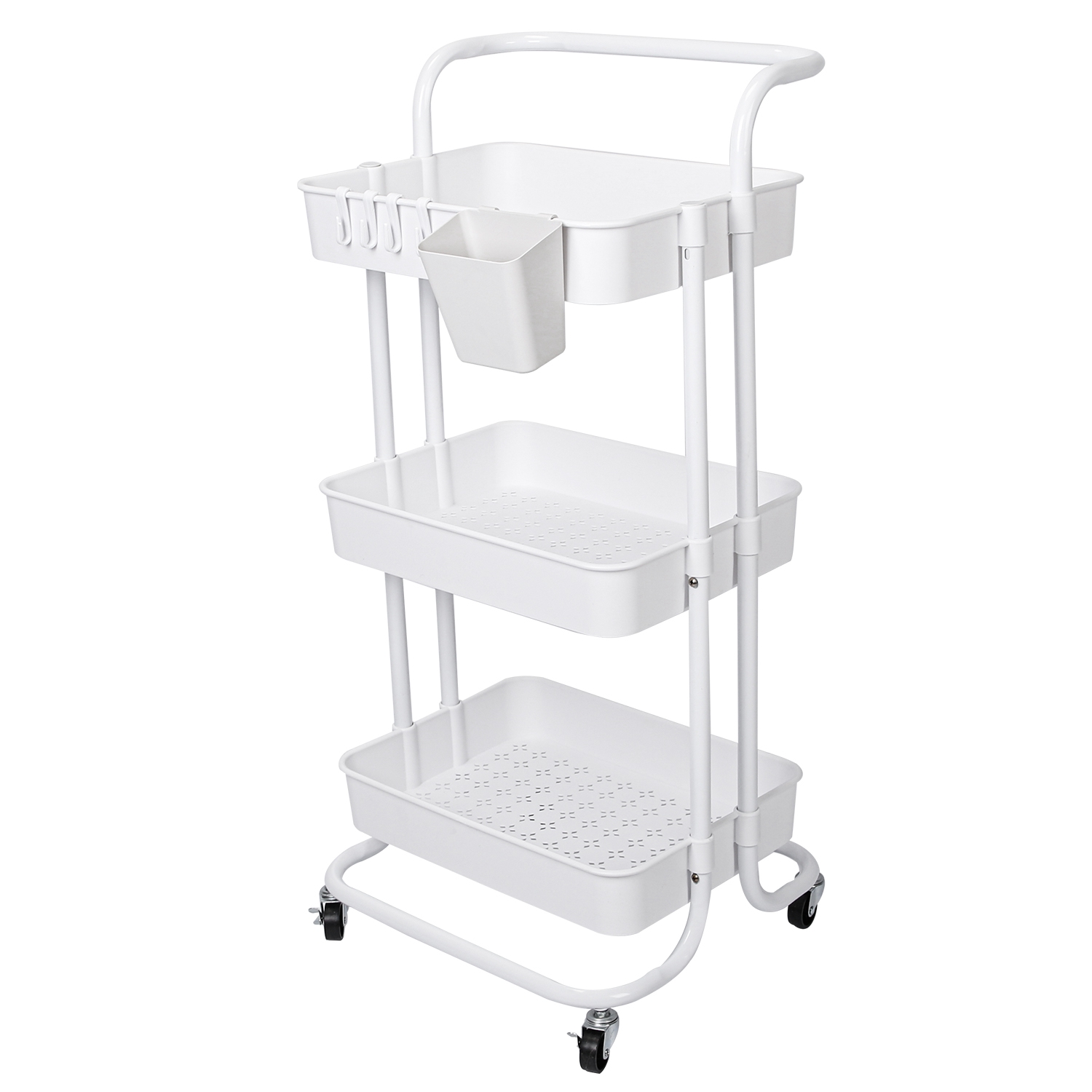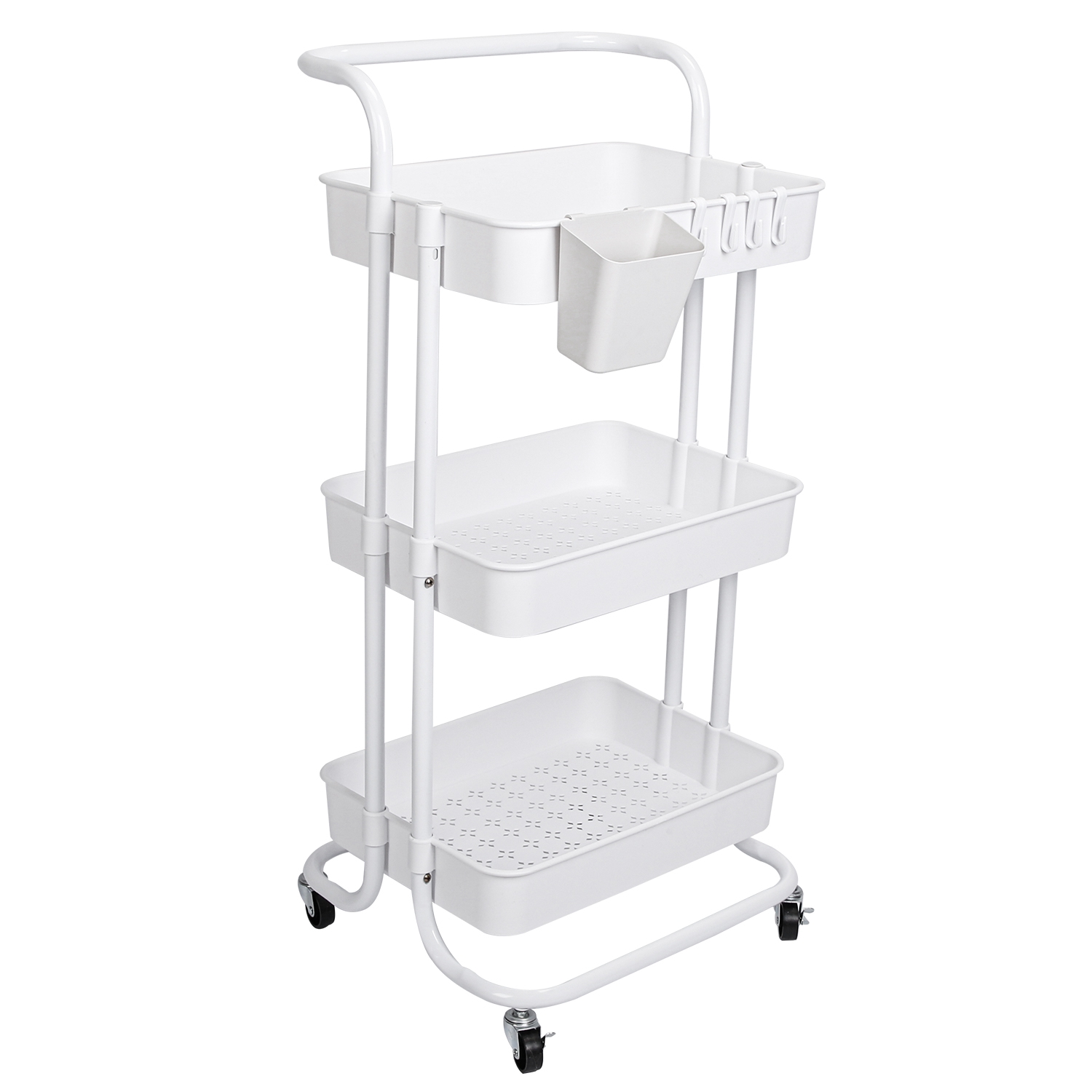 Are you tired of messy room which is full of objects? Our cart with 3 baskets is a perfect solution for home organized. All-directional wheels can easily and smoothly move to anywhere you want and safe lock design allow you to secure it after moving. Made of thickened plastic and sturdy carbon steel, can bear up to 132lbs capacity, long lifespan under normal use. Extra hanging box and hooks provide you more storage space to organize small snacks. A convenient time-saving utility cart to set in office, bedroom, kitchen, bathroom, etc..
