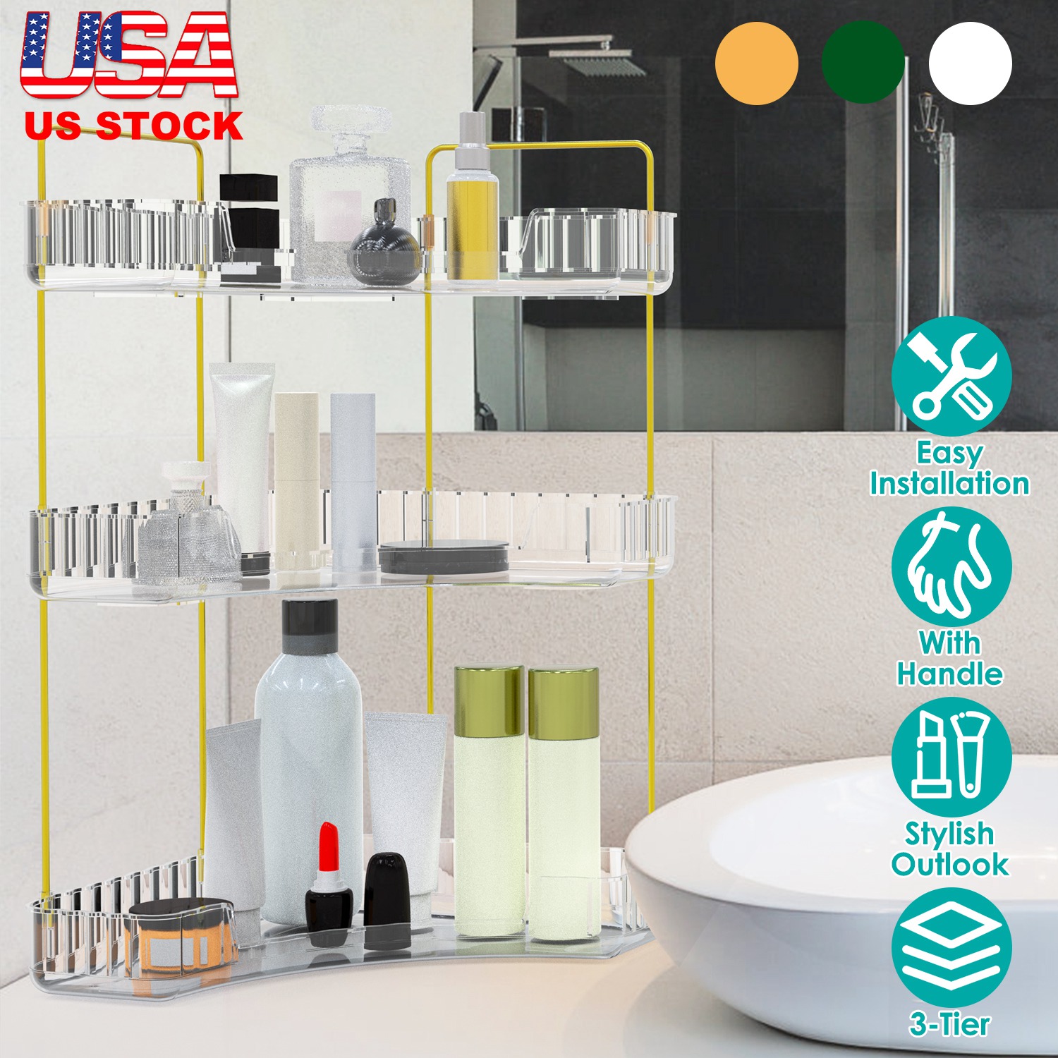 Are you often complaining that the space of your home is too small to contain so many gadgets of yours? Sometimes we cannot change the fact that we have a tiny home with a limited space. However, this bathroom corner shelf can help you fully utilize the corner space to hold condiments, cosmetics, toiletries, etc.. Make your bathroom, bedroom or kitchen tidy and neat. Stylish appearance also adds elegance to your home. Raised edge design can prevent your cosmetic bottle from falling down and handle design helps you carry it more easily. There are three colors for your choice.