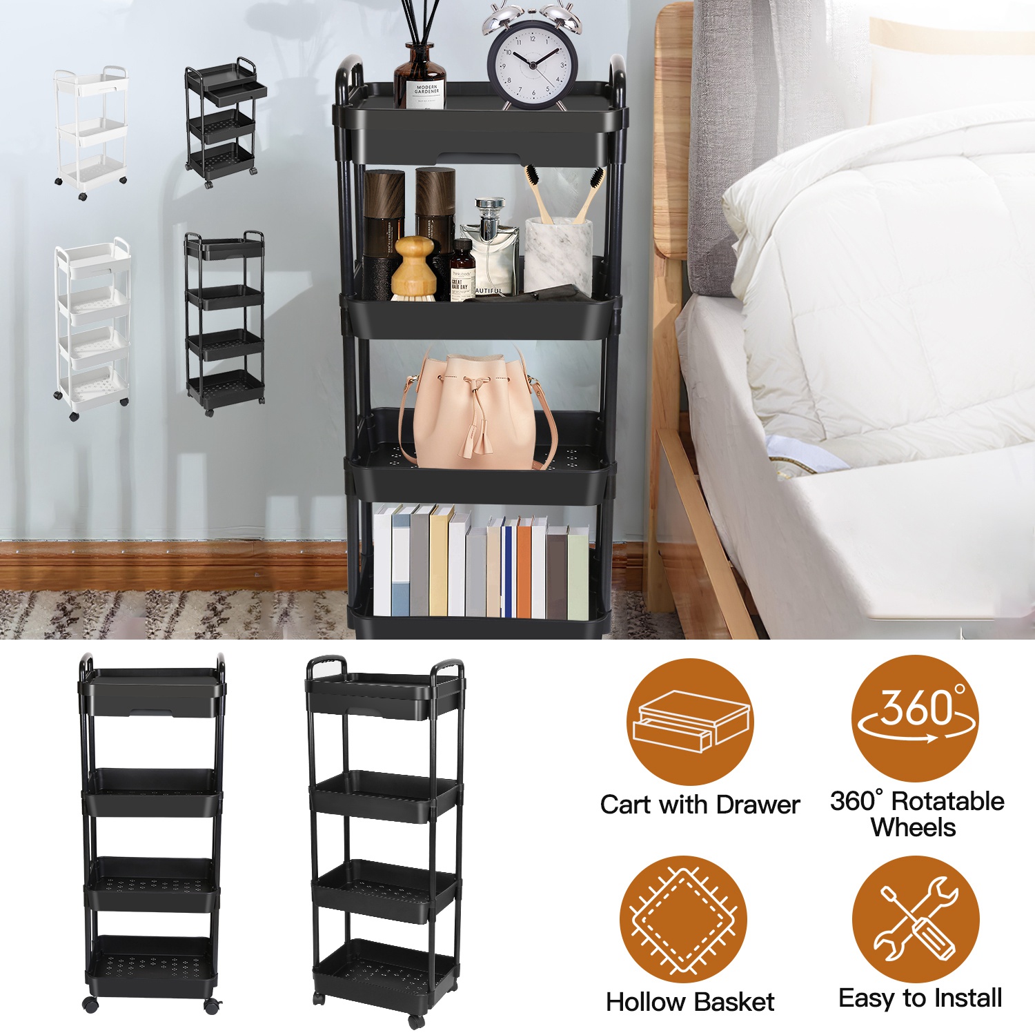 Are you tired of messy room which is full of objects? Our rolling cart with drawer is a perfect helper to keep your home tidy and well organized. Equipped with 360° rotatable wheels, move quietly and smoothly to anywhere you want. Safe lock design allows you to secure it after moving. Made of thickened ABS and sturdy steel, each tier can bear up to 16.5lbs capacity, longer lifespan under normal use. A convenient time-saving utility cart to set in office, bedroom, kitchen, bathroom, etc..